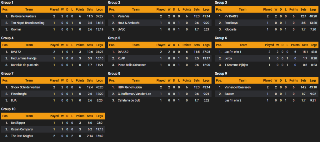 Ook in poule 4 geen verrassingen. Daar won Het Lamme Handje vrij gemakkelijk van Cupfighter DVU 72. Hierdoor wordt de laatste pot nog interessant voor de koppositie. Dan mogen de lammen het namelijk opnemen tegen Dartclub de Punt erin. Zij verloren de eerste ronde verrassend van 72.