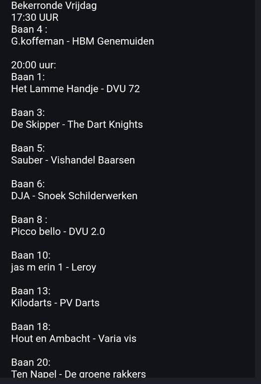 Er zullen morgen 9 wedstrijden gespeeld worden. Jas ‘m erin speelt vanavond al tegen Leroy. De wedstrijden vrijdag beginnen om 20.00 uur in de Dartarena van Dartvereniging Urk!